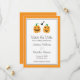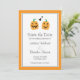 Cute Halloween wedding Save the Date announcement featuring two funny, laughing cartoon Jack o Lanterns with hearts as a symbol of love. Around is an orange and black border. Customizable black text. Add your wedding date, the name of the bride and groom, and where the ceremony takes place. For custom requests or help with customizing please use the store contact link above.