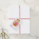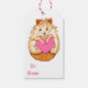 Cute trendy hand drawn hamster holding a heart gift tags featuring a white hearts and pink patterned back.