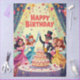 Cute Happy birthday masquerade theme with balloons, cake and confetti.