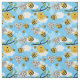 Super cute fabric patterned with happy smiling bumblebees, beehives, honeycomb and flowers over a blue summer sky