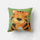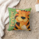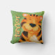Playful smiling big cat art throw pillow cushion perfect for kids babies or toddlers rooms. Cute soft tiger, great in a baby's nursery for nursing or on a kids bed. Customise with your own short name. Currently reads Taylor. Uniquely painted and designed by Sarah Trett.