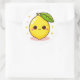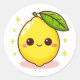 Cute happy yellow lemon with big round eyes and a happy smile. A single green leaf on the top of her head, with lots of sparkles and a pink shadow.