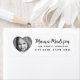 Cute photo return address labels featuring a heart shaped photo and template fields for your name and address on a white or custom colour background. Name or family name in a whimsical script font. Change fonts and colours in the design tool.