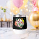 A cute hedgehog sitting amongst colourful summer flowers in a backdrop of black