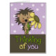 Cute little hedgehog holding a big yellow flower on a purple spotty background, above the words "thinking of you" cards from Ricaso