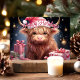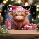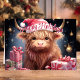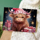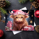 Celebrate the holidays with this charming card featuring a cute Highland cow wearing a Santa hat, surrounded by festive gifts and Christmas decorations. Perfect for sending joyful holiday greetings to friends and family who love whimsical and unique holiday designs.