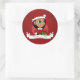 Round stickers with an illustration of a cute little happy smiling Latina/Hispanic or Asian girl with long black hair, who is dressed in Christmas clothes and is wearing a red Santa Claus hat and holding a present; Christmas holidays design on a red background, with an editable text template for your name or message