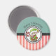 A magnet with a cute Christmas elf in a festive green outfit holding onto a red and white striped candy cane. The background is a layered design with pastel green on the top and red stripes on the bottom. Separated by a strip of black with a chalkboard texture. Merry Christmas written with curved text.