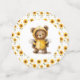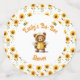 A cute teddy bear dressed like a honey bee. Two bees fly above the text against a background of pretty brown-centred yellow flowers. All text can easily be changed to your information.