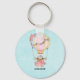 A keychain with an adorable design featuring a watercolor illustration. A hot air balloon decorated wuth pretty red and pink flowers. A cute little white baby bear sits in the basket. Light blue background.