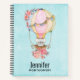 Spiral notebook with an adorable design featuring a watercolor illustration. A hot air balloon decorated wuth pretty red and pink flowers. A cute little white baby bear sits in the basket. Light blue background.