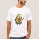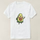 A cheerful cartoon avocado character in a hula dancer outfit. The smiling fruit mascot is wearing a green leaf grass skirt and a vibrant lei made of red and white hibiscus and frangipani flowers while dancing and waving.