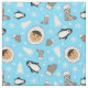 Adorable winter blue fabric with a pattern of cute Inuit Alaskan chirldren, penguins, mittens and fir trees