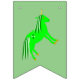 This awesome bunting features a graphic image of a cute Irish unicorn. The unicorn is bright green with a mane and tail made of two more shades of green. It has a bright gold horn and golden hooves. The unicorn has a gold ringed eye and a friendly smile. There are four small Shamrocks on the side of the unicorn.