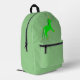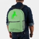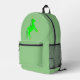 This awesome backpack features a graphic image of a cute Irish unicorn. The unicorn is bright green with a mane and tail made of two more shades of green. It has a bright gold horn and golden hooves. The unicorn has a gold ringed eye and a friendly smile. There are four small Shamrocks on the side of the unicorn.