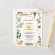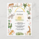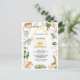 Front is framed with numerous jungle animals, plants, and flowers. Birthday event is backed with sunflower sun and topped with archway of golden yellow watercolor. Colours are jungle green, sunny yellow, golden brown, and soft grey.