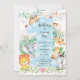 Cute Jungle Big One Boys Birthday Invitation featuring a blue big number one surrounded by safari animals, monkey, giraffe, lion, elephant & zebra on a popular white wood background.