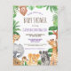Invitations amis et famille pour célébrer votre baby shower avec cette carte postale d'invitation de baby shower animal de safari dans la jungle douce et charmante. Ce design présente de mignons bébés animaux africains tels qu'un éléphant, un zèbre, une girafe, un singe et un lion entouré de feuilles botaniques. Customisez le texte élégant avec la police et la couleur de votre choix ou laissez cette typographie populaire pour votre commodité. D'autres couleurs et styles sont disponibles. Contactez-nous et nous serons heureux de vous aider à faire de votre fête une réussite!