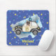 The image features a cute K-9 unit German Shepherd police dog inside a black and white police car surrounded by clouds of different shades of blue with lots of stars as background on a blue colour. The police car has a badge on one door and yellow stars. This modern and adorable image is great for any little boy with a relative in the police force. It can help teach them about law enforcement and community service heroes. The mouse pad is perfect for use at home or school and also makes a great personalized birthday gift since you can customize it with the child's name.