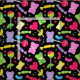 Colourful candy themed fabric patterned with sweet, jelly bears and lollipops on a black background colour