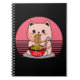 Colourful illustration of a cute, pink Kawaii cat eating ramen from a red bowl on a striped pink sun background