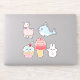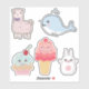 Cartoon themed sheet of stickers with cute Kawaii style characters like a llama, whale, rabbit, cupcake and an ice cream cone.