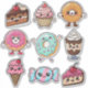 Adorable Kawaii food stickers. This sheet includes cute desserts such as chocolate cake, cheesecake, chocolate pudding parfait, candy, ice cream cone, donuts and a cupcake.