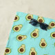 Adorable avocado patterned beach towel features an allover pattern of smiling and winking kawaii avocados in a cartoon style, on a bright summery turquoise background. A cute and trendy design that's perfect for avocado lovers or kawaii fans, you can personalize this quirky chic beach towel with a name along the bottom.