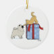 Cute Keeshond Puppy and Kitten Christmas Ornament. Keesie puppy looking at an orange tabby cat on a holiday package. This adorable Xmas ornament makes a sweet gift. Visit Jenn's Doodle World for even more Keeshond lover's art and cartoons. ©Jenn Inashvili