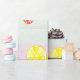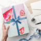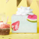 This cute wrapping paper design features a pastel watercolor background with lemons, strawberries, and watermelon slices. So fun for a kids birthday and great for both a boy or a girl.