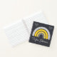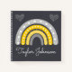 Cute yellow and grey boho rainbow and hearts on a dark grey background.