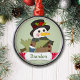 A cute snowman dressed in top hat and plaid coat carries a Christmas tree. At the bottom is a red and white polka dot strip with a white name banner which holds your child's name or other custom text. The image and banner are placed on a light green background. A cute keepsake ornament for your child! *Thanks to Real Deal Clipart for the clipart used to create this design.