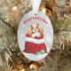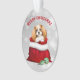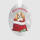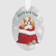 An adorable little Cavalier King Charles Spaniel pops out of a red gift bag on the front of this Christmas ornament. A few teal and gold pattern Holiday tree bulbs lay just in front of the Santa bag.The text above the image says "MERRY CHRISTMAS" in red. The image and text are placed on a silver abstract bokeh background. The back of the ornament has the same image, but with the text "HAPPY NEW YEAR" in teal green.