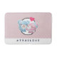 A bathmat with the text: #Truelove. Text is editable / removable. Designed with a cute cartoon image of a bear couple, the she bear is pastel pink with a little bow and she is kissing the cheek of a blue bear who looks positively delighted. A little pink heart is floating above their heads. Very cute and kawaii. Background pattern is a muted pink colour with white polka dots.