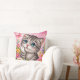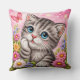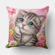 Brighten up your home with this irresistibly cute kitten throw pillow featuring a detailed cross-stitch inspired design. This adorable gray tabby cat with big blue eyes is surrounded by colorful flowers and a delicate butterfly, all set against a soft pink background for a dreamy, cheerful look.