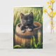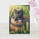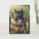 A small black kitten with green eyes sits comfortably inside a wooden barrel amidst a field of tall, green wheat for thinking of you.