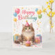 An irresistibly sweet birthday card design featuring a fluffy kitten with bright green eyes, dressed for the occasion in a tiny pink party hat. Sitting front and center, the kitten gazes adorably at a cupcake topped with a glowing candle, surrounded by colorful balloons, streamers, confetti, and neatly wrapped gifts. Soft pastel tones and a clean, light background give the illustration a cheerful, heartwarming feel.