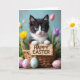 Designed with a close-up view of a tiny black-and-white kitten peeking out from a rustic woven basket, the scene draws you in with bright blue eyes and a curious tilt of the head. Its fluffy fur catches soft, diffused light, and its white paws hold a small wooden plaque as if offering a sweet note to a friend. Centered on the plaque is a short festive greeting in simple lettering, painted in a dark tone that stands out against the warm wood. In the foreground, several pastel eggs with delicate patterns sit near the basket, adding gentle color and a cozy, shared-moment feel. Behind them, blurred tulips in sunny yellow, tender pink, and lavender create a romantic garden haze, like a quiet walk taken together 🌷. The background fades into a calm sky-blue wash that keeps the focus on the kitten’s tender, inviting gaze 🐰. The basket’s woven texture is clearly visible, with soft shadows falling along the rim and across the patterned eggs.