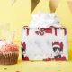 Adorable black and white kitten is wearing a Santa hat and sits with holiday decorations and a wrapped package sitting against a soft fluffy looking snowfall.