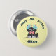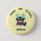 This adorably, cute kitty cat button has a whimsical black cat on it. He has big, green eyes and his sweet little head is embellished with a row of aqua, blue and yellow flowers. It can be customized with the birthday year and the name of the birthday person.