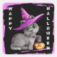 This Halloween sticker for kids shows an adorable little grey kitty cat wearing a purple lavender witch hat and holding a glowing Jack o' Lantern. Vertical white text at the sides says Happy Halloween. Everything is placed on a black distressed edge background, with a matching pink violet border. Perfect for sealing treat bags or Halloween cards!