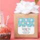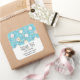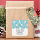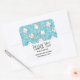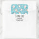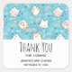 Party thank you stickers with a cute cat pattern, set on a blue background and decorated with rainbows and paw prints and more.