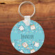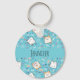 A key chain with a cute cat pattern, set on a blue background and decorated with rainbows and paw prints and more.