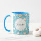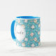 A mug with a cute cat pattern, set on a blue background and decorated with rainbows and paw prints and more.