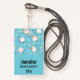 A name tag with a cute cat pattern, set on a blue background and decorated with rainbows and paw prints and more.