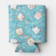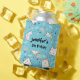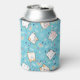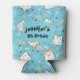 Can cooler with a cute cat pattern, set on a blue background and decorated with rainbows and paw prints and more.