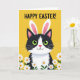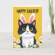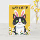 This greeting card features a stylized black-and-white tuxedo cat centred on a rich marigold-yellow background, looking straight ahead with wide green eyes that feel like an inviting glance between friends. Tall bunny-like ears sit on its head, with soft pink inner details that add a gentle, affectionate touch 🐰. A small rosy nose and a simple curved mouth give the cat a calm, sweet expression, like it’s quietly sharing a warm hello. Across the top, a seasonal greeting appears in dark lettering, placed high and easy to read against the yellow. Along the bottom edge, a row of white, daisy-like flowers with yellow centres stretches across, with thin green stems that lightly frame the scene 🌷. The strong contrast between the cat’s dark patches and the bright background makes the character stand out without any extra clutter. The lower border shows clustered white petals and sunny yellow centres, with slender green stems rising just above the bottom margin.