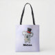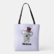 A tote bag personalized with a name with an illustration of a cute grey koala eating some eucalyptus leaves, wearing a fancy black top hat with a red ribbon. Set on a light purple digital watercolor background.