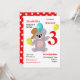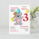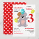 Super cute Australian koala bear teddy surrounded by party balloons and wearing a traditional hat and pointing to your child's age which is shown here as one for a third birthday but feel free to edit this to suit any age.