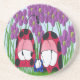 The new addition to the ladybug family has just arrived. It's a rare, blue ladybug! Proud parents, who stand tall, and proud as they show off their unique little bug. There is green grass below them, and purple funky textured daisies above with blue skies.